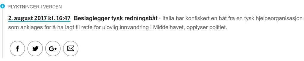 Natt til 2. august ble skipet Iuventa, som den tyske «humanitære» organisasjonen Jugend Rettet benytter i migranttrafikken mellom Libya og Italia, tatt i arrest av italiensk kystvakt utenfor Lampedusa og ført til havn. Dette rapporterte Christian Skaug her på Document samme morgen. Over et halvt døgn senere rapporterer NTB: Italia beslaglegger tysk redningsbåt. Saken publiseres av et par-tre lokalaviser, Klassekampen og ABC Nyheter. NRK har faktisk en egen sak på ettermiddagen. La du ikke merke til den? Ikke så rart, den befinner seg i kanalens nyhetsfeed, og består av èn (1) setning: