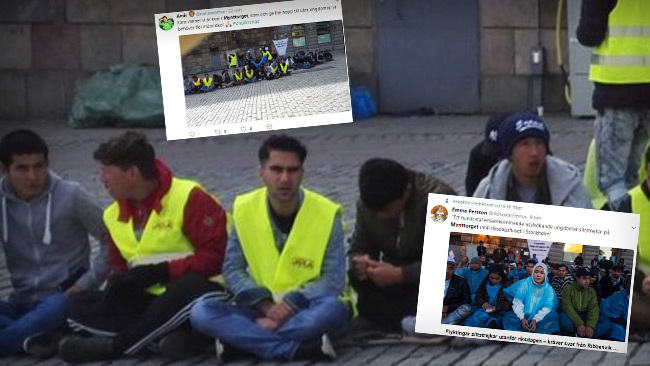 Ensamkommande flyktingbarn demonstrerer ved Riksdagen i Stockholm. OBS: Dette er ikke pressebildet som er omtalt i artikkelen. (Foto fra Twitter / montasje)