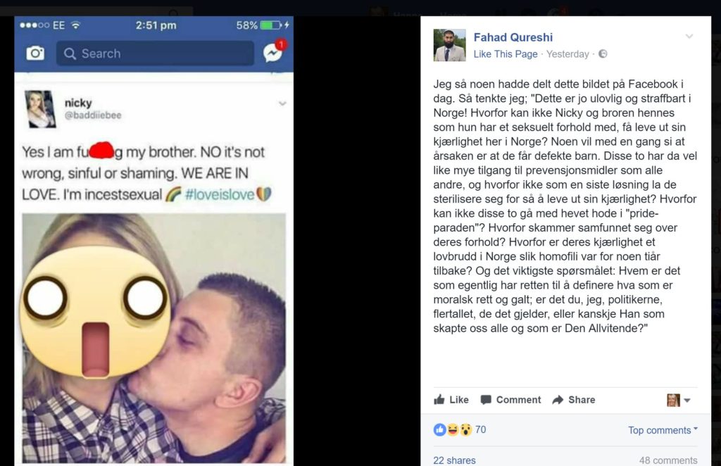 Salafisten Fahad Quershi fra Islam Net la søndag ut et bilde på sin Facebook-vegg som sirkulerer på sosiale medier. Bildet skal være av en bror og søster hvor hun sier at hun har sex med broren sin fordi de elsker hverandre.