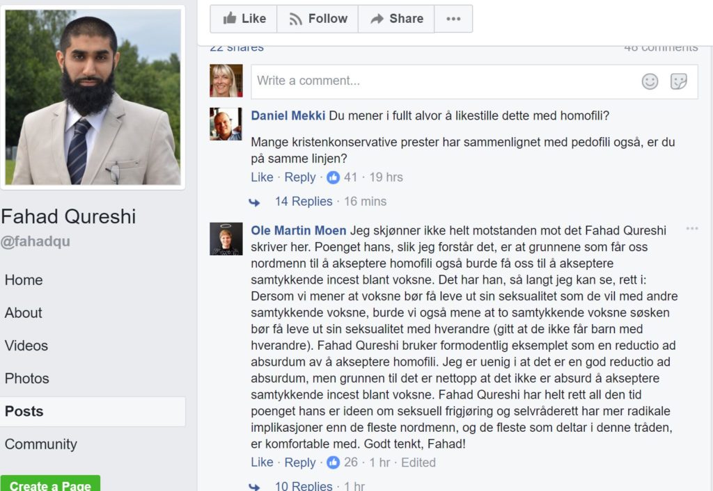 Vi er egentlig ikke så veldig opptatte av hva Fahad Quershi mener om incest. Han poster dette bare for å provosere. Derimot leser vi med interesse på Facebook-veggen hans at humanisten Ole Martin Moen roser Quershi.