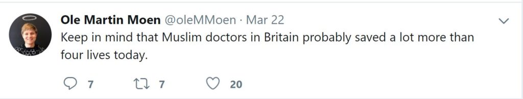Ole Martin Moen bagatelliserte også terroren på Westminster Bridge den 22. mars. På Twitter skrev han: