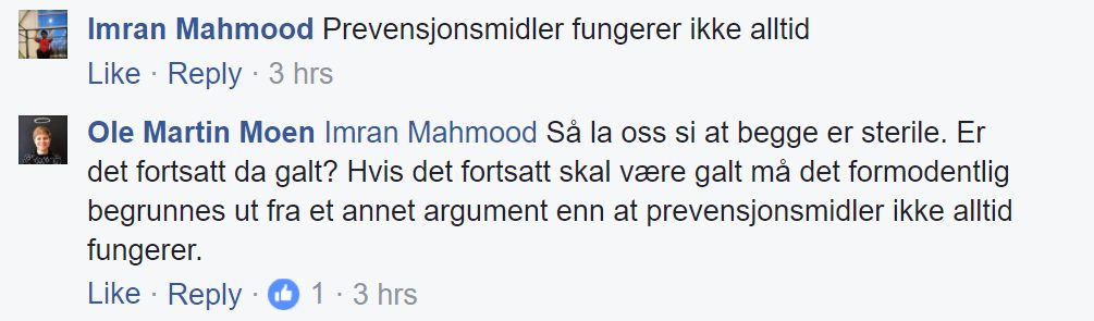 Ole Martin Moen Jeg skjønner ikke helt motstanden mot det Fahad Qureshi skriver her. Poenget hans, slik jeg forstår det, er at grunnene som får oss nordmenn til å akseptere homofili også burde få oss til å akseptere samtykkende incest blant voksne. Det har han, så langt jeg kan se, rett i: Dersom vi mener at voksne bør få leve ut sin seksualitet som de vil med andre samtykkende voksne, burde vi også mene at to samtykkende voksne søsken bør få leve ut sin seksualitet med hverandre (gitt at de ikke får barn med hverandre). Fahad Qureshi bruker formodentlig eksemplet som en reductio ad absurdum av å akseptere homofili. Jeg er uenig i at det er en god reductio ad absurdum, men grunnen til det er nettopp at det ikke er absurd å akseptere samtykkende incest blant voksne. Fahad Qureshi har helt rett all den tid poenget hans er ideen om seksuell frigjøring og selvråderett har mer radikale implikasjoner enn de fleste nordmenn, og de fleste som deltar i denne tråden, er komfortable med. Godt tenkt, Fahad!
