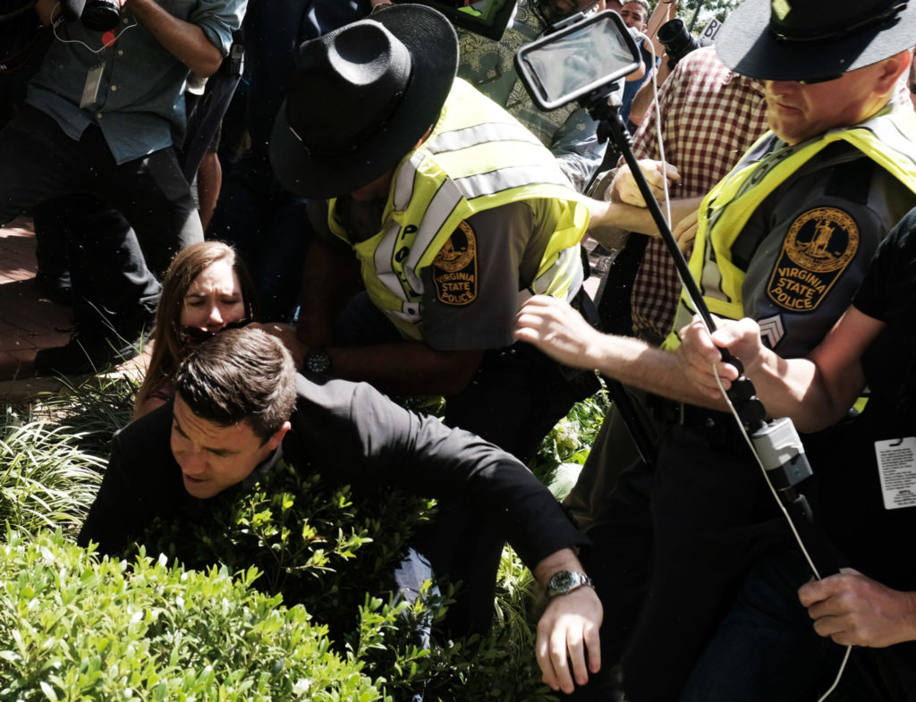 Bildet: En av initiativtakerne til marsjen i Charlottesville, Jason Kessler, ville holde en pressekonferanse søndag, men ble overfalt av en dame som la ham i bakken. Politiet måtte gripe inn. Etter nedkjøringen av motdemonstranter lørdag var det ikke mye stemning for å la ham snakke. Foto: Justin Ide/Reuters/Scanpix