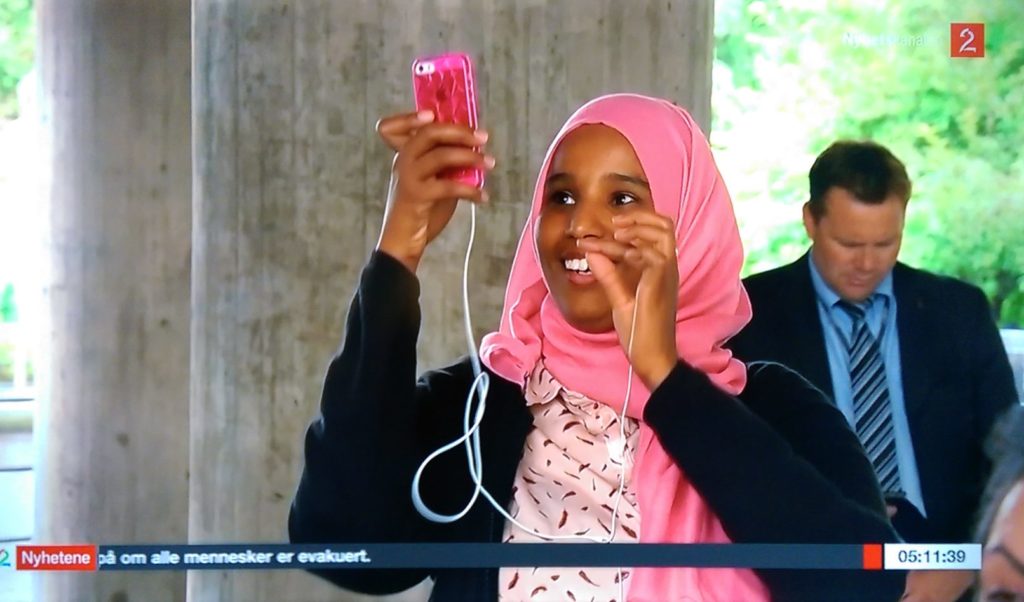 En entusiastisk amatørfotograf i knallrosa hijab og ditto telefon tok bilde av Sylvi.