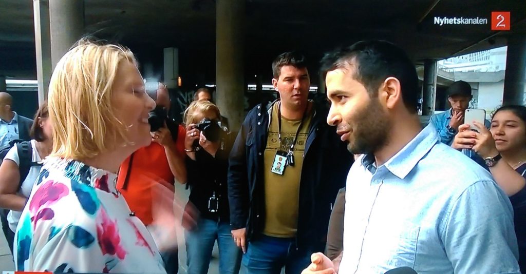 «Folk smilte og hilste, også på justisministeren», sier reporter Zaman, mens bildene viser en innvandrer som løper etter justisminister Amundsen og med et bredt smil tar ham i hånda for å hilse. I den andre hånda har han en take-away-kaffe.