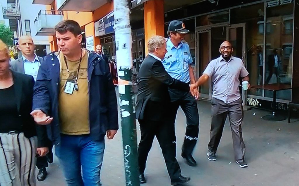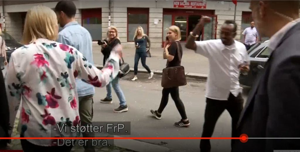 «Andre ropte slagord til støtte for FrP», sier reporter Kadafi Zaman, og mens Listhaug og Støjberg går på fortauet, ser og hører vi en mørkhudet mann i hvit skjorte løfte høyre arm med knyttet neve mens han sier høyt og tydelig: