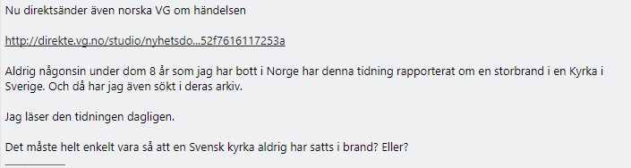 Det er interessant at også NTB melder om moskébrannen i Sverige. Norske medier er omtrent like interesserte i alle kirkebrannene i nabolandet som de er i bilbrannene. Her et innlegg fra et frustrert svenske i Norge: