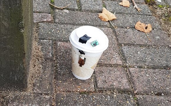 I et travelt shoppingområde i den engelske byen Stevenage oppdaget man onsdag morgen en kaffekopp med microchips og ledninger. Dette første straks til panikk, bombealarm og evakuering av området. En kontrollert sprengning ble utført av bombegruppen som ankom.
