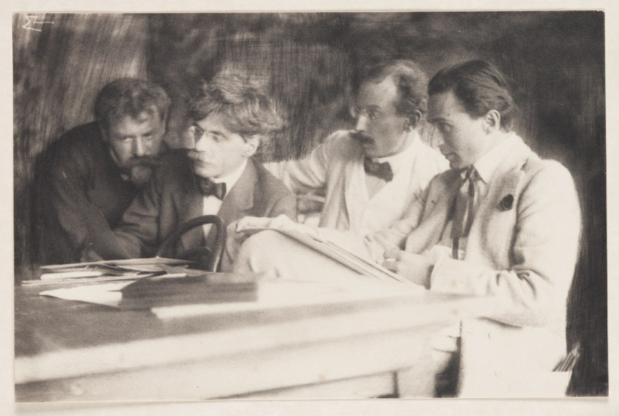 De fire fotografer er fra venstre Frank Eugene selv, som viser egne bilder til sine venner og fotograf-kolleger Alfred Stieglitz (1864-1946), Heinrich Kühn (1866-1944) og Edward Steichen (1879-1973).
