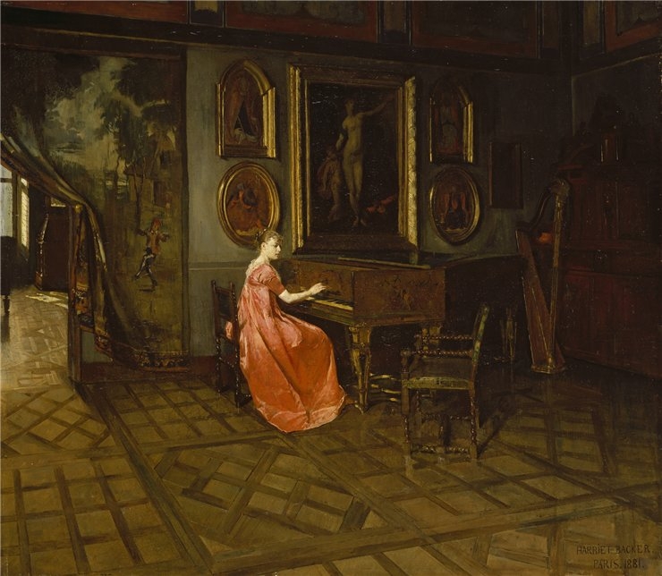 Man vil kanskje se at dette later til å være det samme interiør vi finner i maleriet Andante I, også fra 1881. Dette er visstnok Harriet Backers første avbildning av en pianist (det skulle bli mange flere), og så vidt jeg har klart å finne ut er Andante I nå i Stavanger kunstmuseum.