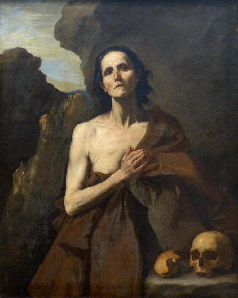 Riberas bilde viser Maria i det hun har fått kappen, foran henne restene av brødet og en hodeskalle.