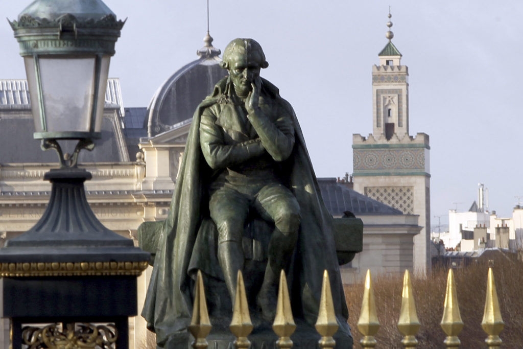 Bilde: Statue av Jean Baptiste Lamarck med moskeen i Paris i bakgrunnen og det naturhistoriske museet til venstre. Bildet er tatt 10. desember 2009, like etter at sveitserne sa nei til minareter. Et slikt resultat gjør inntrykk i Frankrike. Foto: Charles Platiau/Reuters/Scanpix