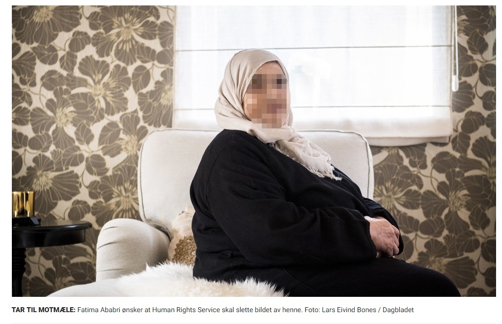 Fatima Ababri (76) så ikke bildet selv, men ble i forrige uke fortalt at et bilde av henne var publisert på Rights.no, nettsiden til HRS. Denne «grusomme handlingen» som består i at noen har tatt et bilde av deg på offentlig sted hvor du er en del av bybildet og til og med sladdet ansiktet ditt, er nesten ikke til å leve med for Fatima. Så hun velger å stille i Dagbladet med et stort portrettbilde. Hvis du ikke visste hvem Fatima Ababri var på bildet utenfor Oslo City, så vet du det iallefall nå! Det sørger Dagbladet for.