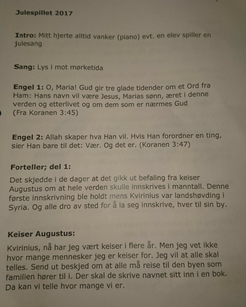 Igjen ser vi at det ikke finnes noen grenser for å inkludere islam. Selv om muslimer ikke en gang feirer jul, skal koranvers og Allah lures inn. Vi vil få en oppvoksende generasjon av barn som tror at Allah og Koranen har noe med jul å gjøre. Og dette er det våre læreinstitusjoner som fremmer.