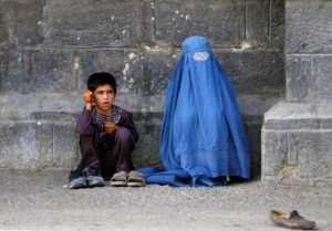 Afghan woman and her son beg at mosque on the first day of Eid al-Fitr in Kabul
