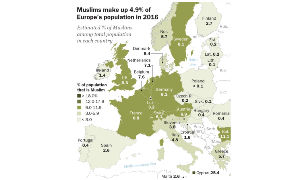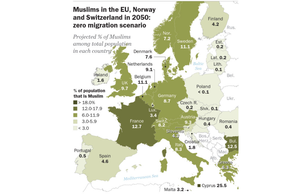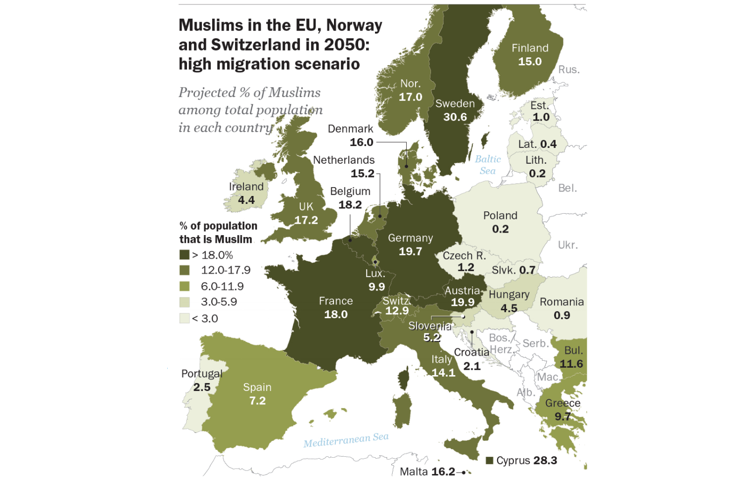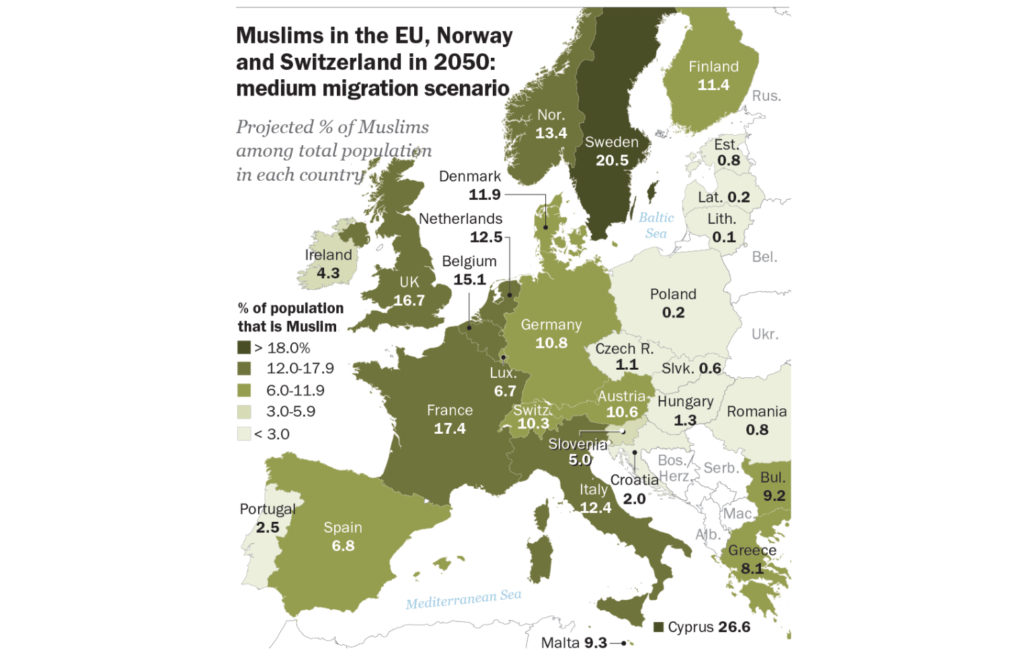 Ifølge Pew Research vil det være 36 millioner muslimer i Europa i 2050 i tilfellet null innvandring, 58 millioner med medium migrasjon og 76 millioner ved høy migrasjon.
