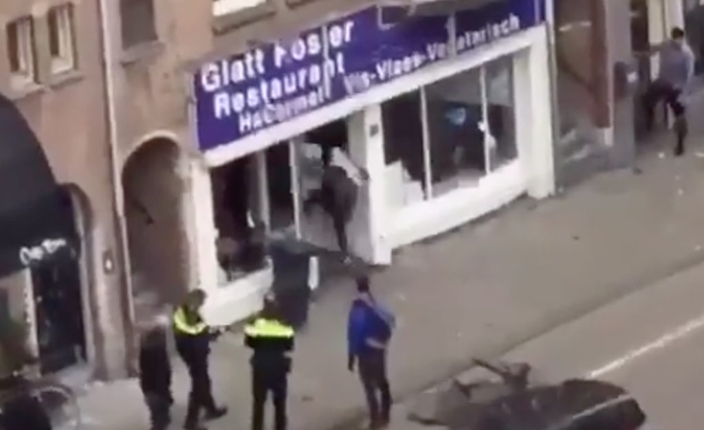 En mann med palestinaskjerf, palestinsk flagg og en kjepp er arrestert i Amsterdam etter at han knuste vinduene på en kosher-restaurant i den nederlandske hovedstaden mens han ropte «Allahu akbar!».