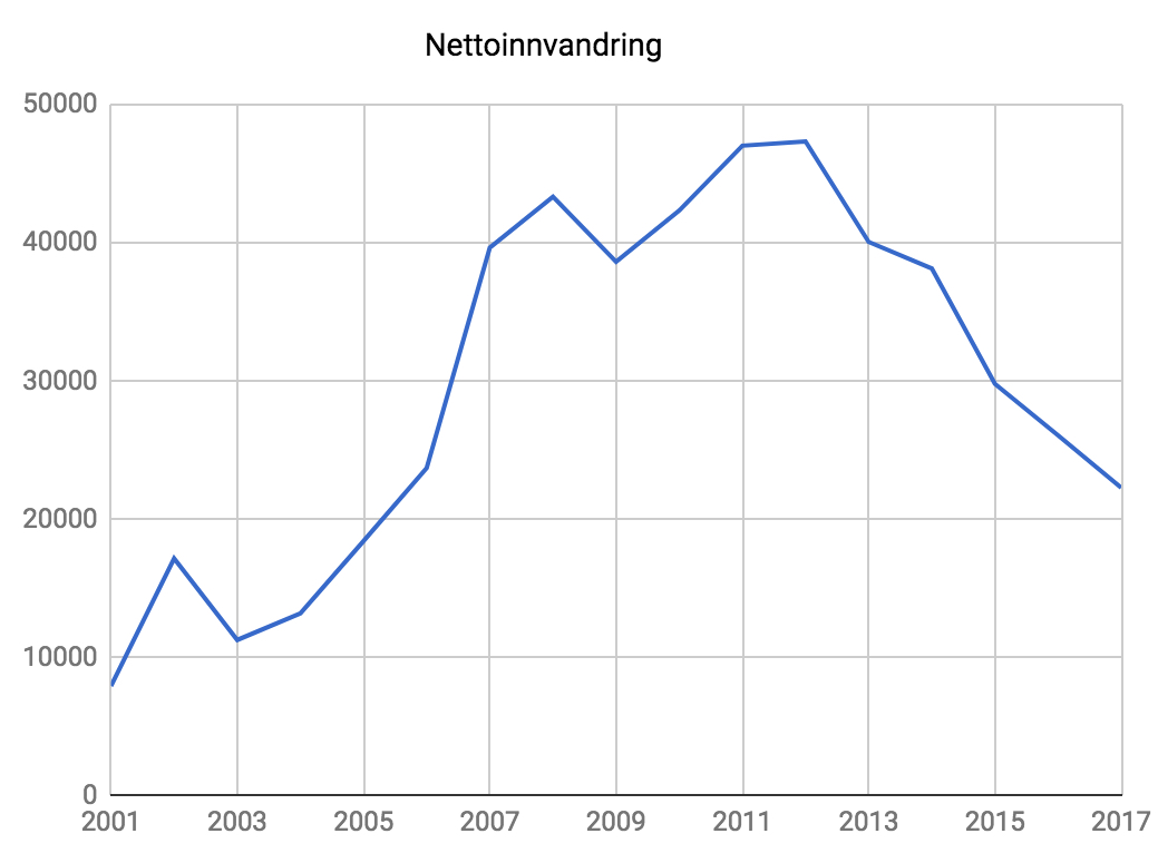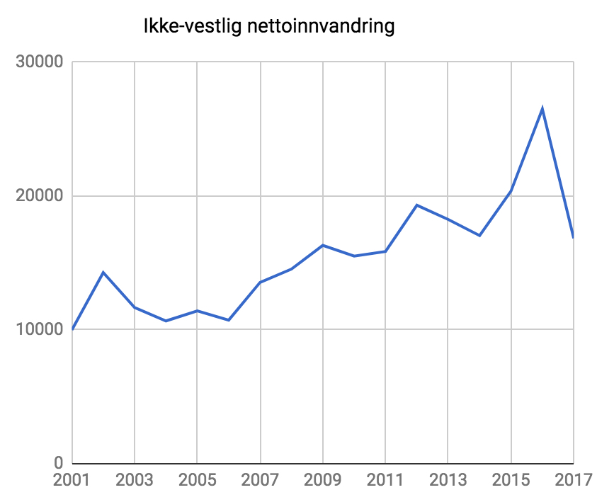 Man mistenker at svaret er nei, og tallene for de tre første kvartalene av 2017 tyder da heller ikke på det: I statistikkbankens Tabell 11327 finner vi at den totale nettoinnvandringen i 1., 2. og 3. kvartal var på henholdsvis 6428, 5218 og 6862 personer, hvorav henholdsvis 4880, 4315 og 4787 kom fra Asia med Tyrkia, Afrika eller Latin-Amerika.