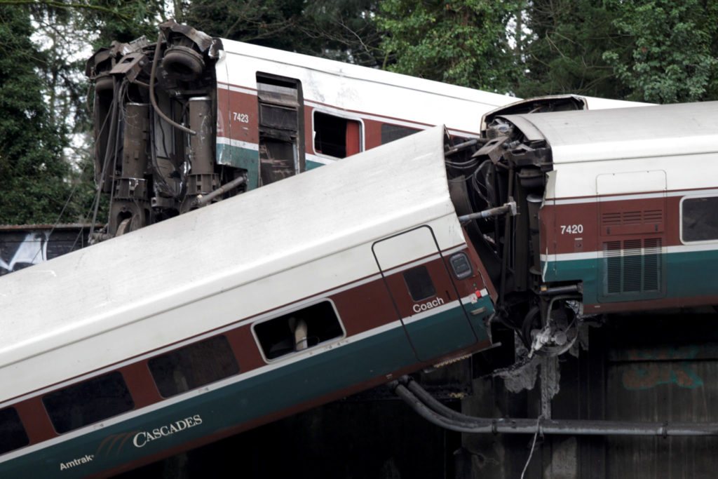 En hindring på sporet kan være årsaken til at et tog sporet av sør for Seattle i USA. Minst seks mennesker omkom og dødstallet kan stige.