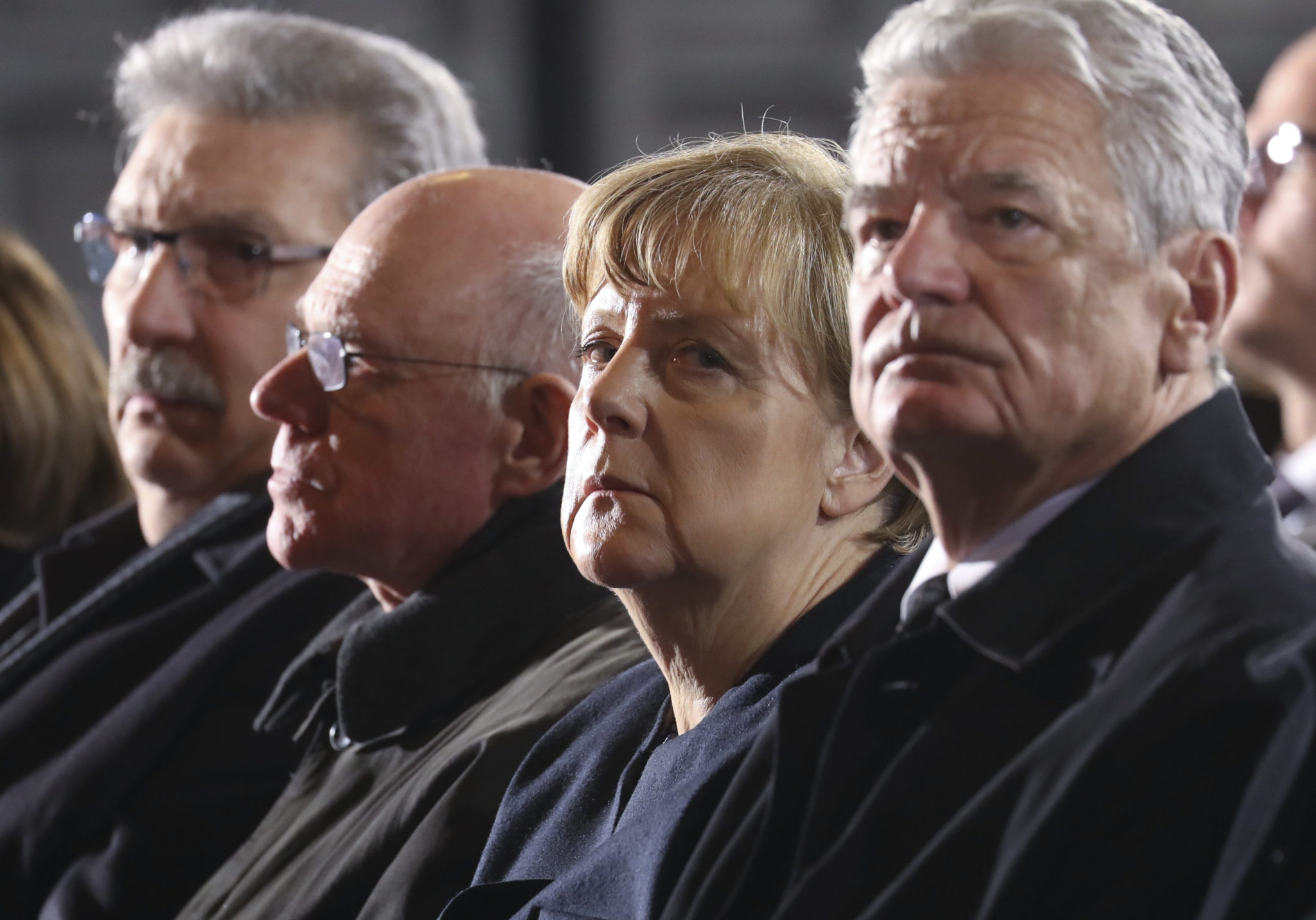 German President Joachim Gauck, Chancellor Angela Merkel and Norbert Lammert, President of Germany’s lower house of parliament Bundestag (from R) attend a service at Berlin’s Memorial church (Gedaechtniskirche) to commemorate the 12 killed victims of a truck that ploughed into a crowded Christmas market at Breitscheidplatz in Berlin, Germany, December 20, 2016. REUTERS/Michael Kappeler/Pool