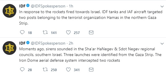 Tre raketter ble fredag skutt mot Israel fra Gaza, melder israelsk militære (IDF). To av rakettene ble skutt ned ved hjelp av Israels luftvernsystem (Iron dome missile defense system) og den tredje traff en bygning sør i landet. Det ble ikke meldt om sårede eller skadede. Israel besvarte angrepet med å angripe to Hamas-baser.