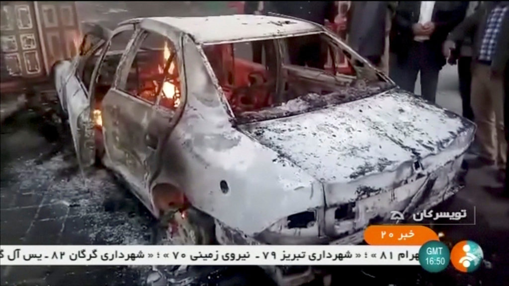 Bilde; En utbrent bil i Zanjan, 1. januar 2018. Foto: Reuters/Scanpix
