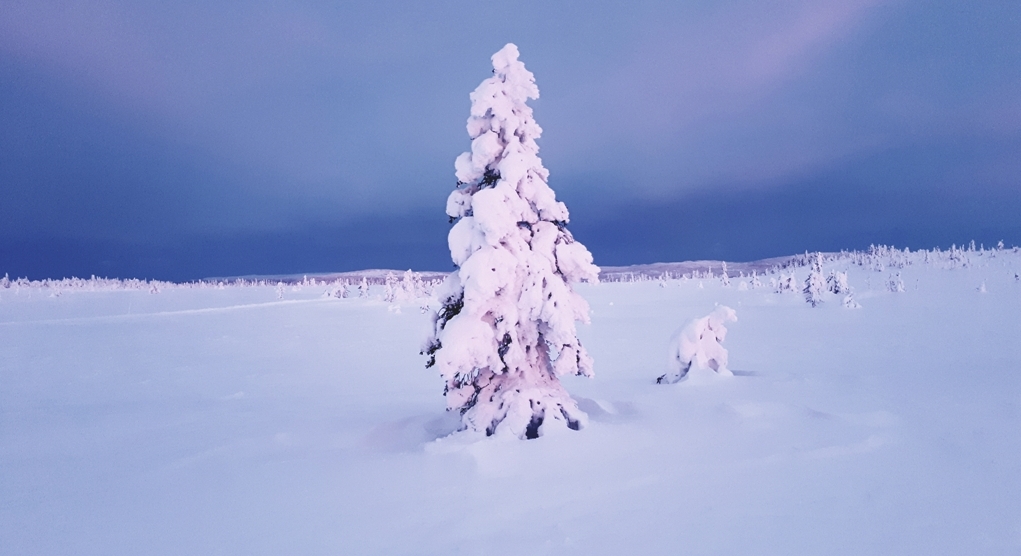 Men jeg glir og glir innover i denne dalen der det er helt stille, der snøen henger tungt på gran og furu, og der bjørkene ser ut som digre frostroser der de står med sine spinkle greiner og skiller seg ut. Ved vendepunktet inne i dalen er det hektet et termometer i ei bjørk, slik at man kan lese av temperaturen. Det kan være mye kaldere her enn på parkeringsplassen som er utgangspunktet for turen. Det står en kar ved termometerbjørka, der det også er hengt opp en postboks med ei besøksbok som folk kan skriver navnet sitt i. Han ser også ut til å være i pensjonsalderen, med et friskt, rødmusset fjes og et tidsmessig, moderat skjegg.