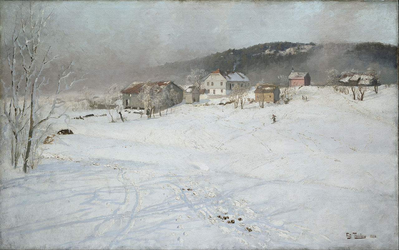 Dette vintermotivet er hentet fra Vestre Aker, der familien Thaulow var bosatt, nærmere bestemt ved Frøen like ved Majorstuen. Der finner vi også stedsnavnet Volvat, der malerens far apoteker Harald Conrad Thaulow hadde sin bolig fra 1866 (Volvat er det opprinnelige danske familienavn Tavlov skrevet baklengs).