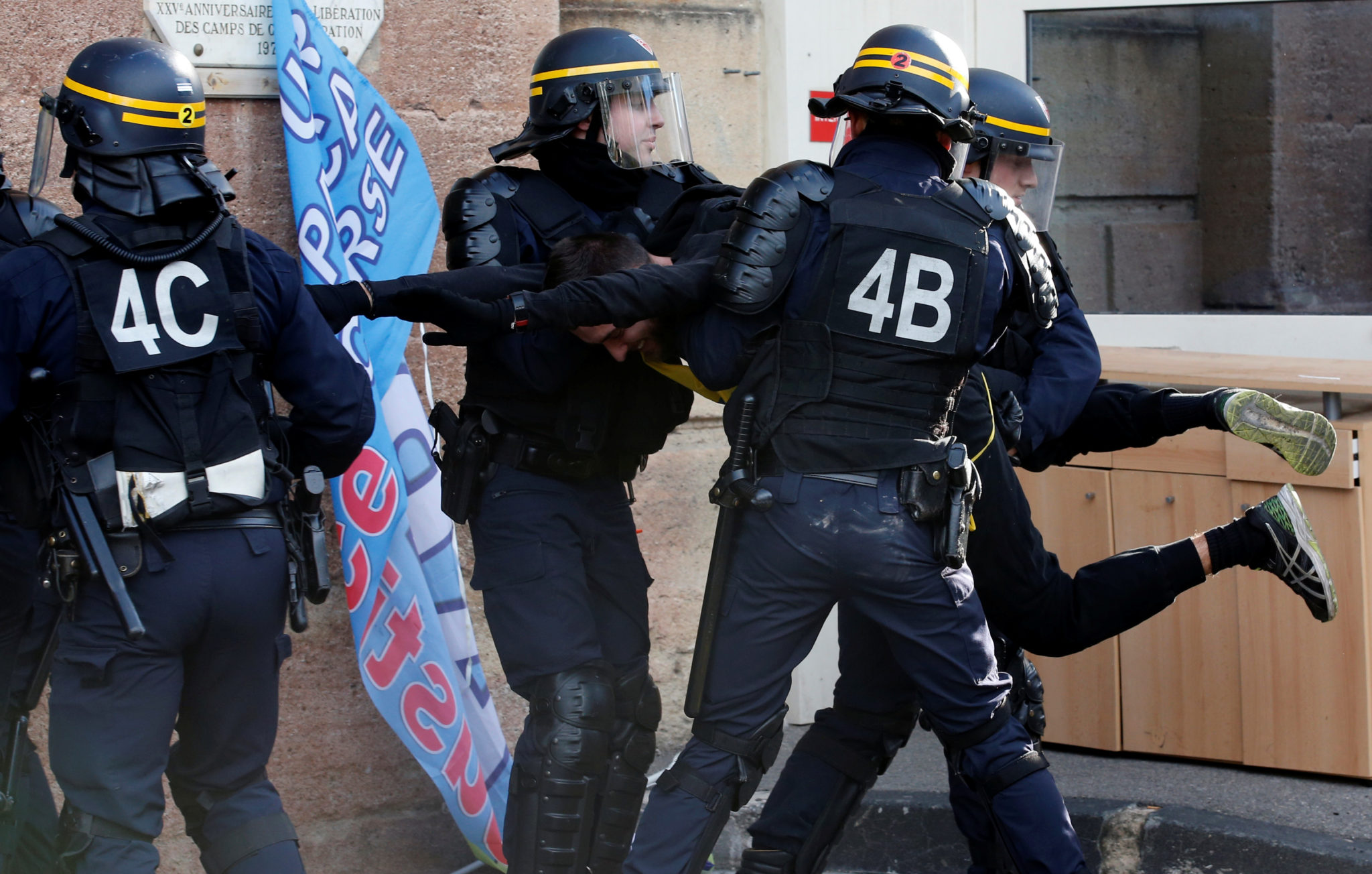 En fengselsansatt fjernes av opprørspolitiet. Foto: Jean-Paul Pelissier / Reuters / Scanpix.