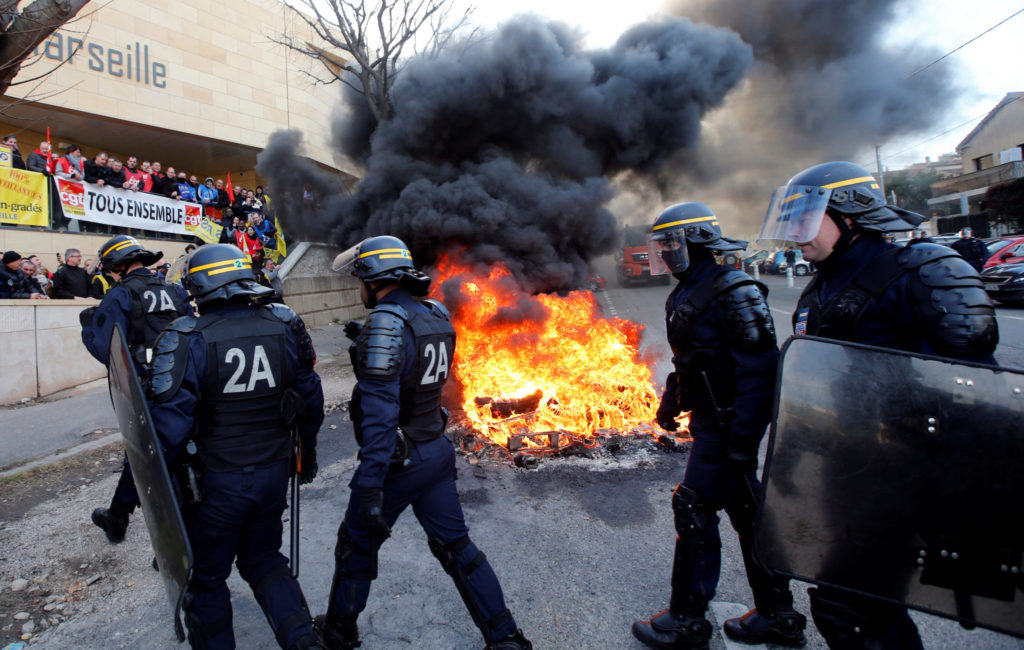 Fransk opprørspoliti kommer til Baumettes-fengselet i Marseille, hvor streikevakter venter den 22. januar 2018. Foto: Jean-Paul Pelissier / Reuters / Scanpix.