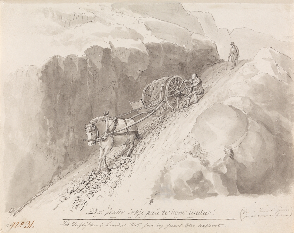 Da’ staur inkje pau te’ kom’ unda’! (som omtrent kan gjengis med Ikkeno’ problem å komme seg nedover!) Nyt Veistykke i Leerdal 1845 som dog snart blev kasseret.