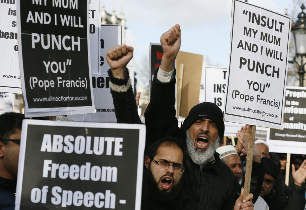 Like etter massakren på Charlie Hebdo-redaksjonen og angrepet på supermarkedet Hypercacher presterte pave Frans å si at hvis noen fornærmet hans mor, kom han til å teve til vedkommende. Dette fanget islamister opp og som man ser av plakatene, gjorde de pavens ord til sine. Demonstrasjonen ble holdt i nærheten av Downing Street 8 februar, snaue fire uker etter massakren. Foto: Stefan Wermuth / Reuters / Scanpix