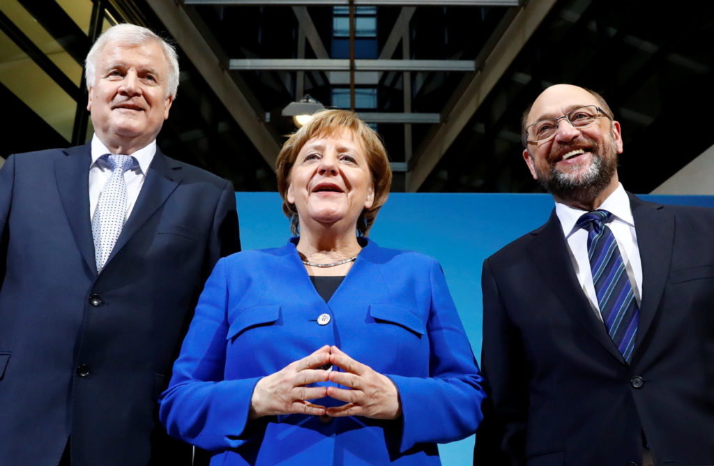 CSU-leder Horst Seehofer, CDU-leder og statsminister Angela Merkel og SPD-leder Martin Schulz etter sonderingene med sikte på en ny tysk storkoalisjon i Berlin den 12. januar 2018. Foto: Fabrizio Bensch / Reuters / Scanpix.