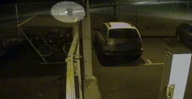 I den lyse sirkelen øverst i bildet tenner gjerningsmannen lunten til sprengstoffet. (foto: polisen)