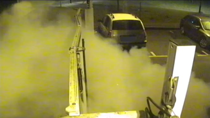 Det tar nesten ett og et halvt minutt før ladningen detonerer med et kraftig lysglimt, fulgt av røykutvikling. I kanten av bildet ser man gjerningsmannen ta beina fatt inn i mørket.