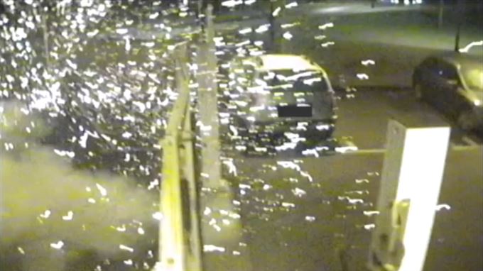 Mannen som kastet bomben mot politihuset i Rosengård i Malmö ble fanget på overvåkingsvideo. Bomben detonerer med et kraftig lysglimt og et regn av splinter. (foto: polisen)