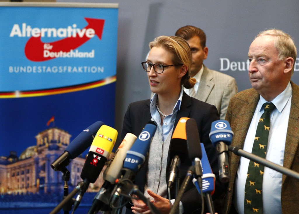 AfDs parlamentariske leder Alice Weidel og partiformann Alexander Gauland møter pressen etter sitt første parlamentariske møte i Berlin den 26. september 2017. Foto: Fabrizio Bensch / Reuters / Scanpix.