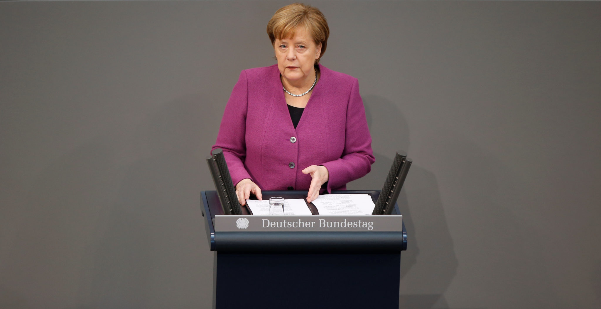 Tysklands statsminister Angela Merkel taler til Forbundsdagen i Berlin den 22. februar 2018. Foto: Axel Schmidt / Reuters / Scanpix.