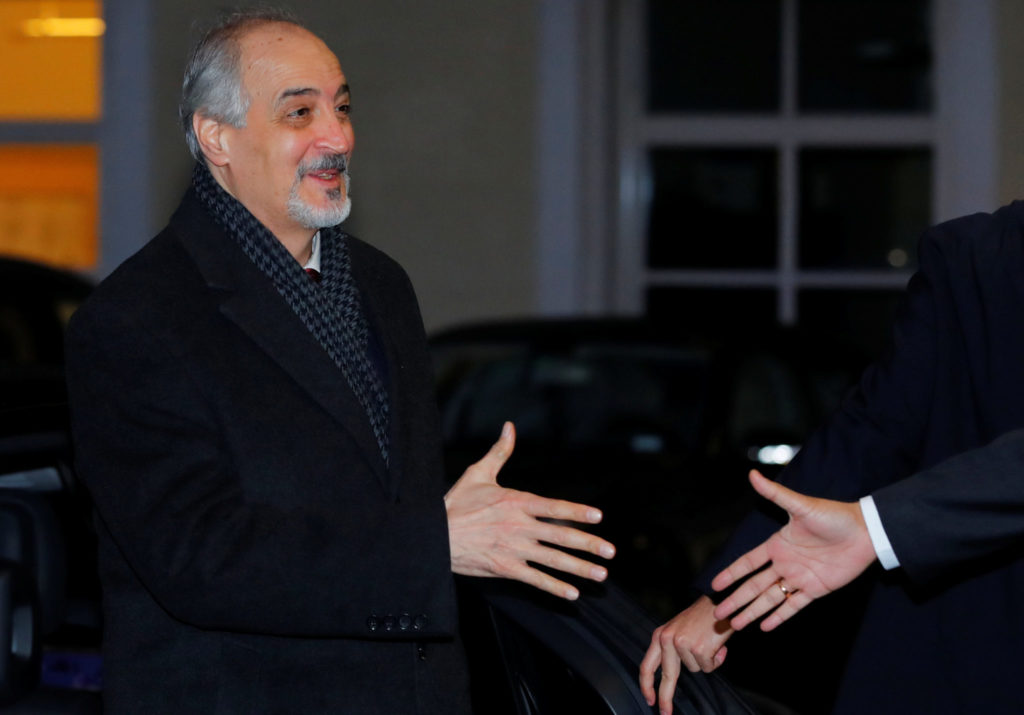 Bildet: Krigsforbrytelser ingen hindring. Syrias FN-ambassadør og sjefforhandler Bashar al-Ja’afari møter en utstrakt hånd. Geneve 17 november 2017. Foto: Denis Balbouse/Reuters/Scanpix