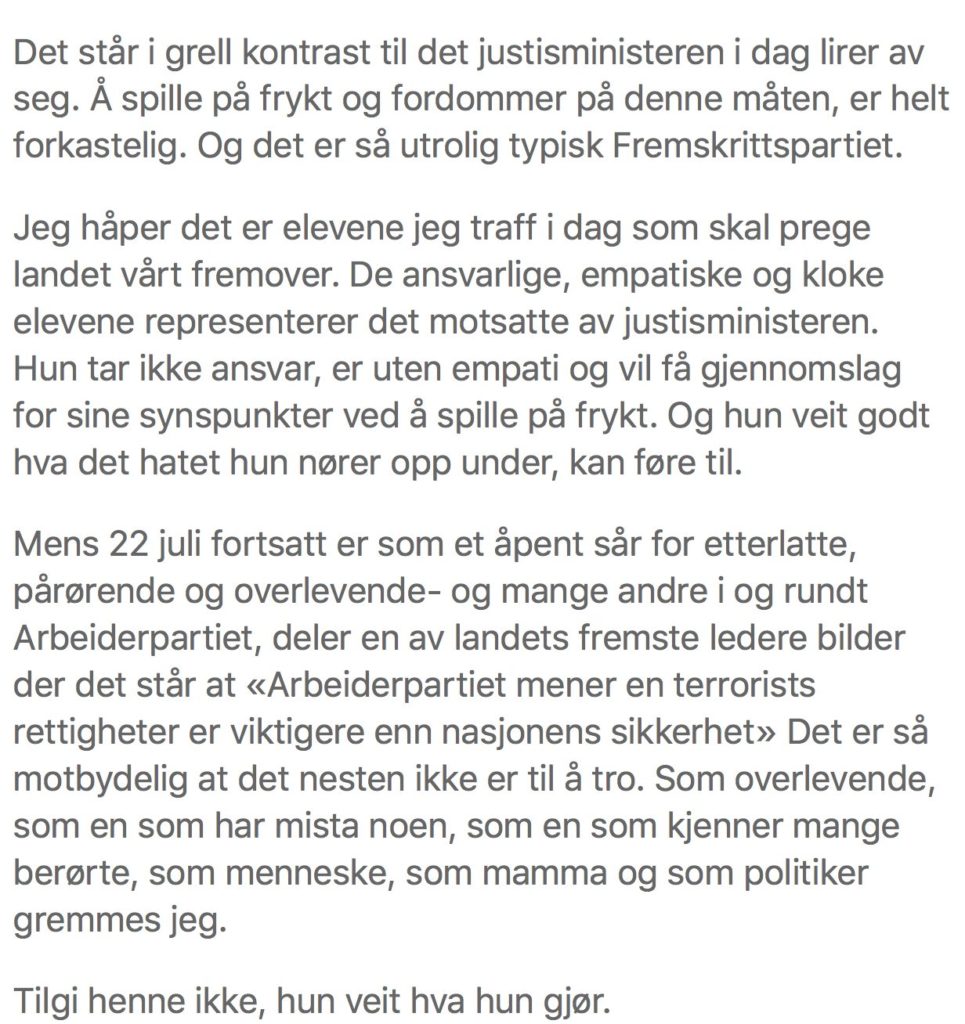 Bildene og beretningen om Utøya utløste ikke hat og ikke ønsker om hevn. Men det gjør justisministeren: