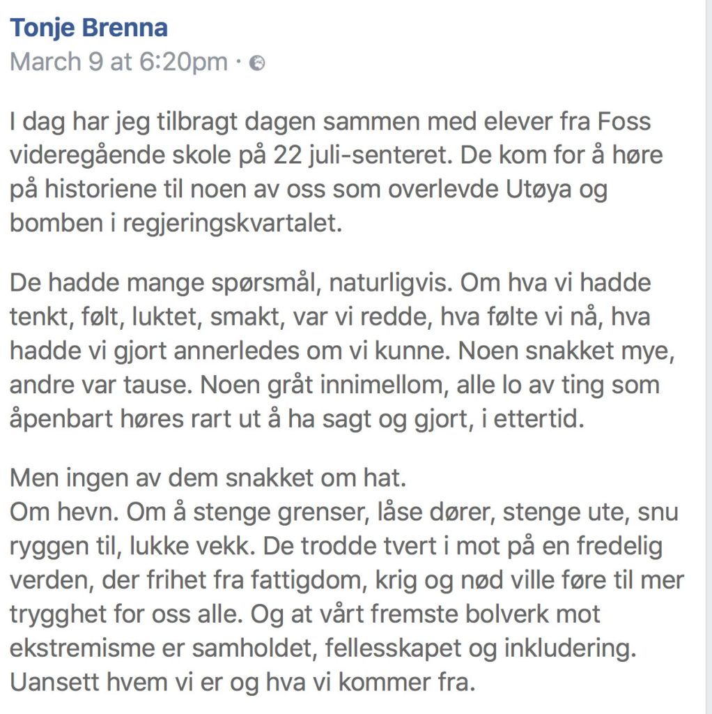 Venstresiden er svært lite åpne for selvkritikk. Den har alltid sittet langt inn. Men la oss ta tidligere generalsekretær i AUF, Tonje Brenna, på ordet. Torsdag kveld la hun ut på Facebook: