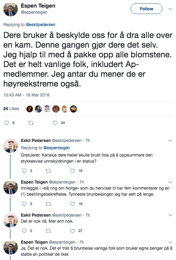 – En veldig ekstrem gruppe har i dag oppfordra sine følgere til å sende henne blomster. At hun stolt viser frem blomsterhav blant annet fra rasistiske og konspiratoriske grupper på nett viser at hun slett ikke forstår hva hun måtte beklage fra Stortingets talerstol i går, sier han.