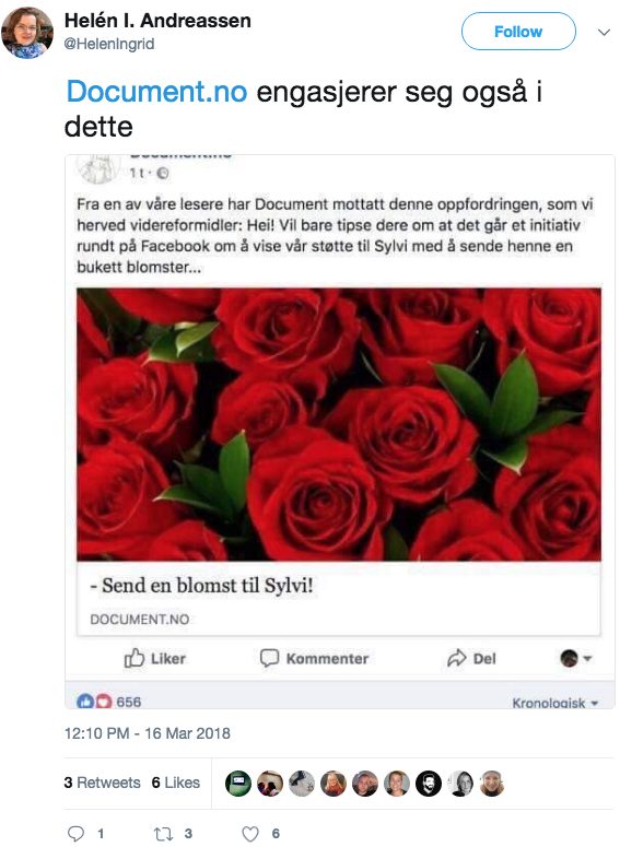 Helén Ingrid Andreassen, som overlevde Utøya og som er aktiv i Oslo Ap, reagerer sterkt på Listhaugs blomsterbilde, noe Document har omtalt. Fredag la Andreassen ut et bilde på Twitter av blomsterhavet i Oslo etter 22. juli, og så bildet av Sylvi med blomstene i Justisdepartementet like etter.
