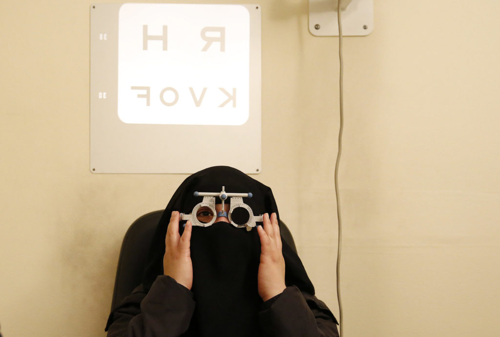 Ansiktsdekkende plagg blir forbudt i alle norske barnehager, skoler og høyere utdanningsinstitusjoner, dersom regjeringen får flertall for et nytt lovforslag. Hos optikeren vil det stadig være tillatt. På bildet: Konvertitten «Brenda» hos optiker i London, 2014. Foto: Olivia Harris / Reuters / Scanpix