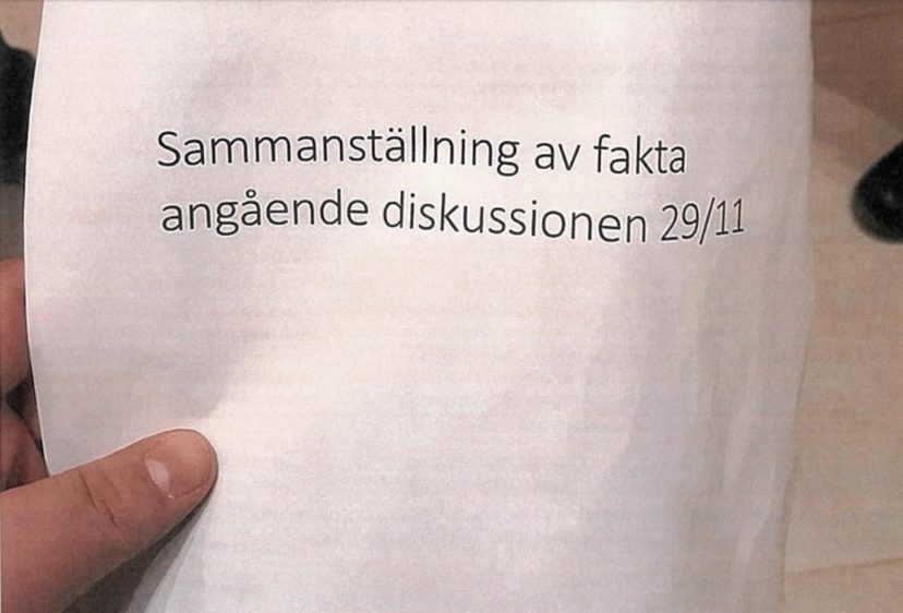 Før møtet hadde Felix en forelesning. Da kom to forelesere, utbildningsledaren Anders Lindström och jämställdhetssamordnaren (sic) Anna Josefsson, uanmeldt inn i salen. Uten å nevne Felix’ navn begynte de å snakke om hvor alvorlig de så på det inntrufne, og lovet å «agera direkt».