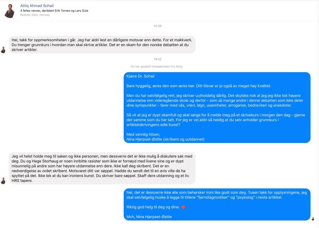 Sohail likte ikke dette noe særlig. Ja, han likte det så dårlig at det tippet helt over og han tok kontakt med Nina på Facebook. Og la dermed lista enda lavere for debatten (han står vel egentlig og tråkker på den).