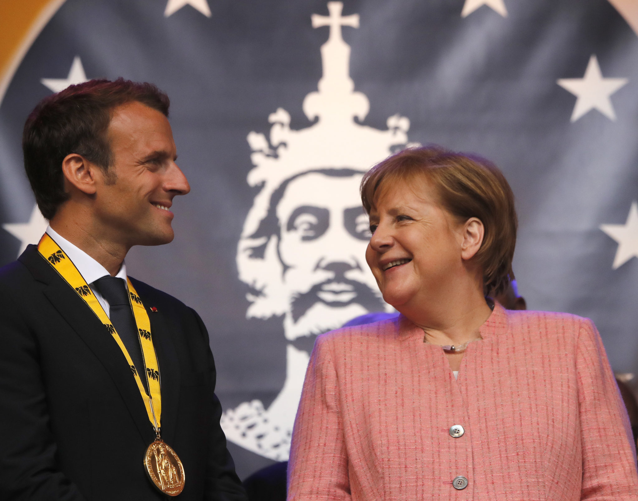 Frankrikes president Emmanuel Macron blir tildelt Karlsprisen av Tysklands statsminister Angela Merkel i Aachen den 10. mai 2018. Foto: Wolfgang Rattay / Reuters / Scanpix.