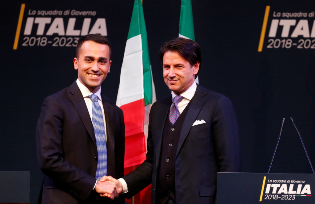 Femstjernersbevegelsens leder Luigi Di Maio trykker hånden til partifellen Giuseppe Conte under en presentasjon av potensielle statsråder i Roma den 1. mars 2018. Foto: Remo Casilli / Reuters / Scanpix.