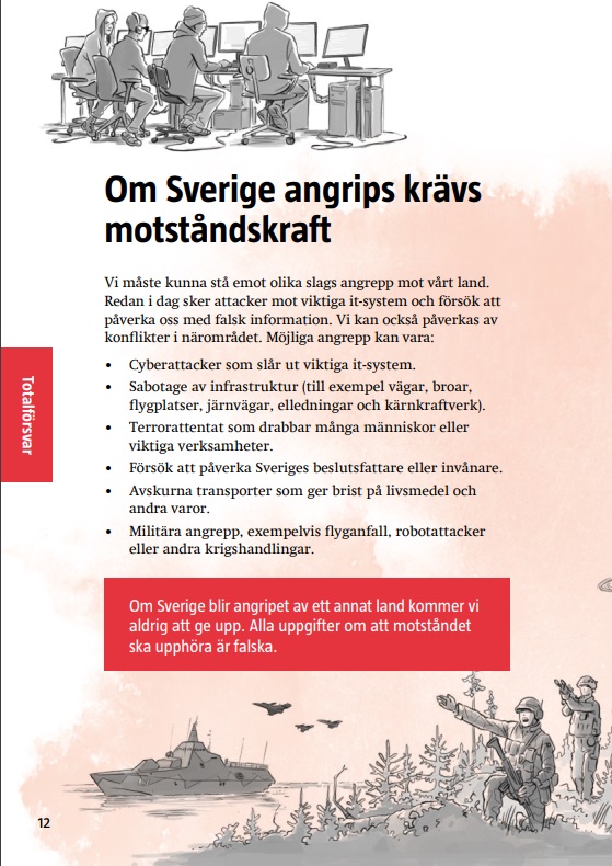For første gang siden 1961 utgir svenske myndigheter en brosjyre om hvordan man skal forholde seg i en krise- eller krigssituasjon. Brosjyren skal sendes til alle landets 4,8 millioner husstander. Den inneholder råd for å sørge for at man har vann, mat og varme i tilfelle en krise oppstår. Det gis også tips om hvordan man skal kunne kommunisere med omverdenen. Brosjyren fokuserer mer på krisesituasjoner enn krig, skriver SVT.