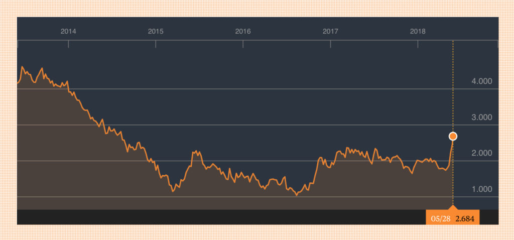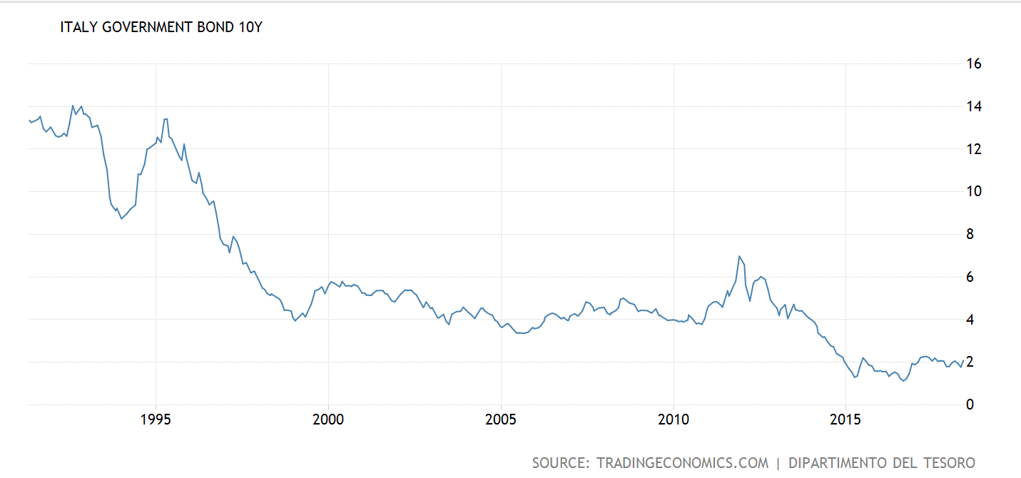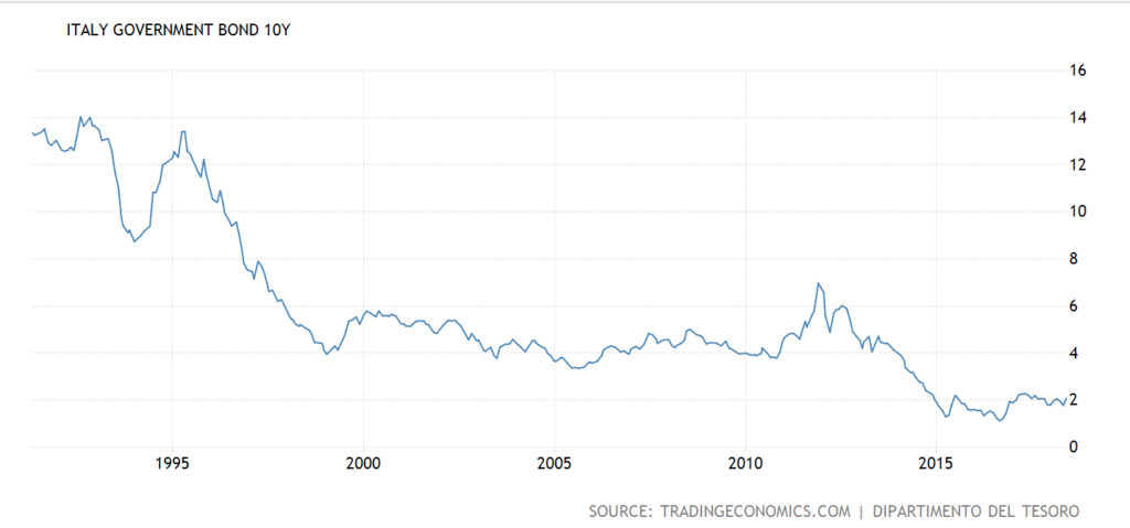 Om man f.eks. tar en titt på Bloombergs historikk over renten på de tiårige BTP-obligasjonene, fremtrer dette bildet for de siste fem årene: